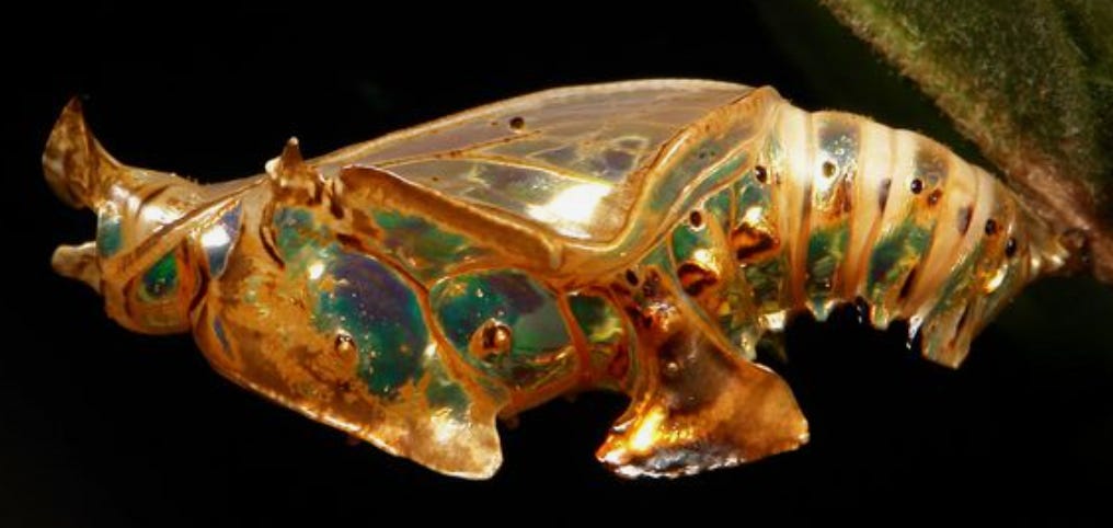 contrary to popular belief, caterpillars do not rest at all within their chrysalises. in fact, they are in a state of rapid, hyperactive transformation. it’s quite gory, actually. within its iridescent bubble, the caterpillar’s body digests itself from the inside out. the same juices that once nourished the caterpillar as a larva turn on its physical being completely. the caterpillar begins consuming its own flesh, cell by cell, until it melts from its once solid form into GOO. liquidized!
