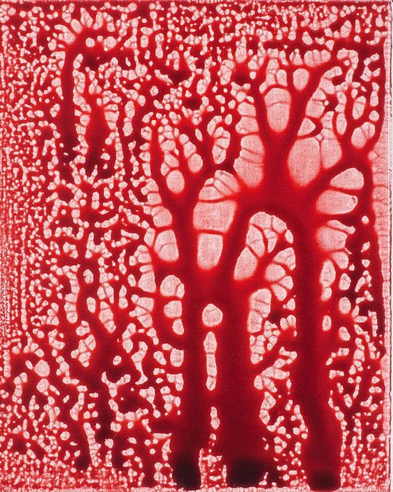 we will be touched, we’ll touch others. our cells will die and they will be reborn our eyelashes will fall and they will regrow blurry. we’ll plant seeds in our stomachs. we’ll let the roots grow through our intestines they’ll poke holes and the acid will drip out the explosion juice will eat our organs we will MELT. our intestines will be un-twisted from their redspools, they’ll be unstrung; we’ll wrap them round our necks and we’ll tie them on fate looms. we’ll go [down and up and down and up] we’ll fleshweave our tapestries from the Goo of our own bodies; from our catatonic elements. إن شاء الله Ameen.
