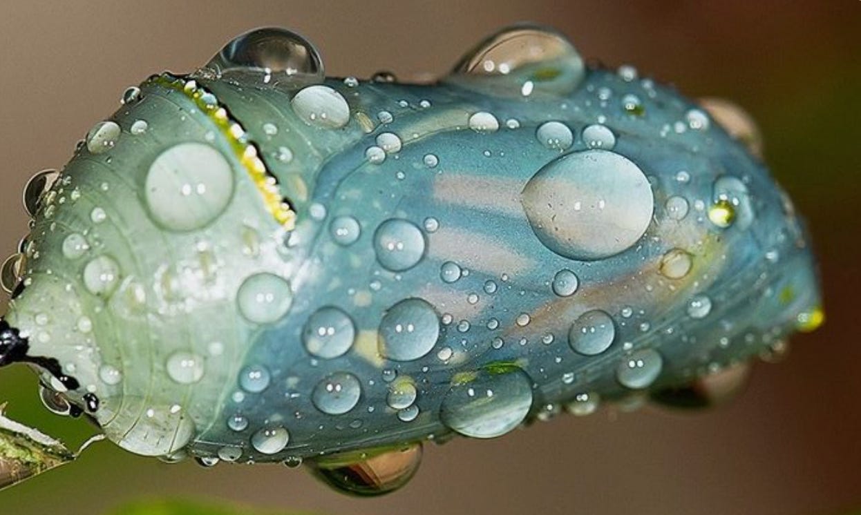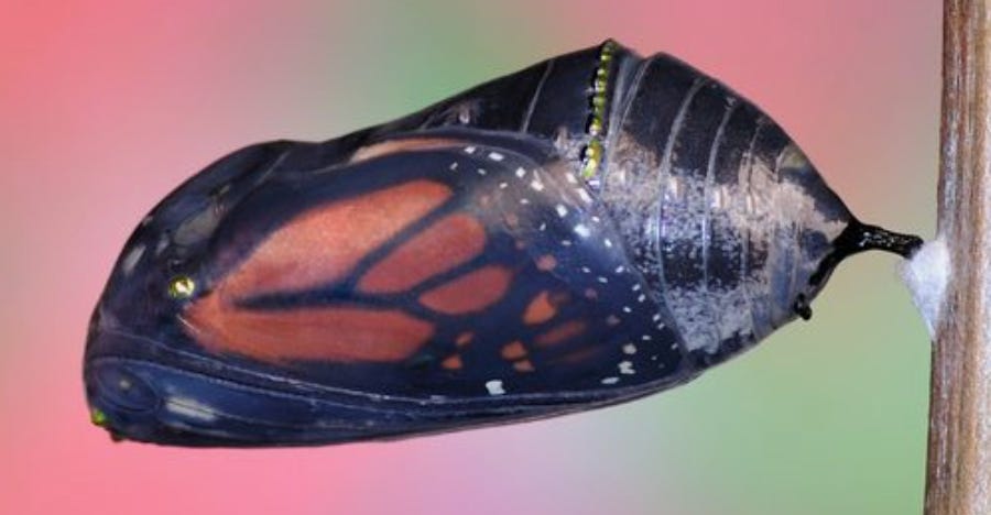 this is the truth. the butterfly life cycle involves four stages: egg, larva, pupa, and adult. the metamorphosis occurs during its pupa stage. during this transformative period, the caterpillar’s old body dies and a new one is born. this occurs within a protective shell called a chrysalis. the caterpillar spins the chrysalis around itself with silk. it can be of many colors, soft or hard, solid or web-like, see-through even. chrysalises hang in concealed, safe locations–on the undersides of little branches; leaves.
