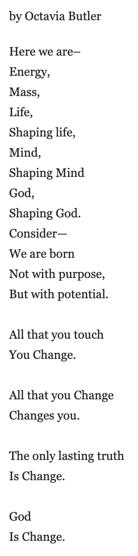 octavia butler says GOD IS CHANGE. her book, parable of the sower, took place in the year 2024. we’ve entered the year 2024. this is her poem ‘earthseed’